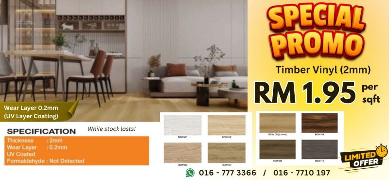 - News -Promotion RM1.95 / sqft for Timber Vinyl (2mm). Wear layer 0.2mm with UV Layer coating to last longer. Choose your favourite colour and transform you ... https://m.jjc.com.my/index.php?ws=latestnews